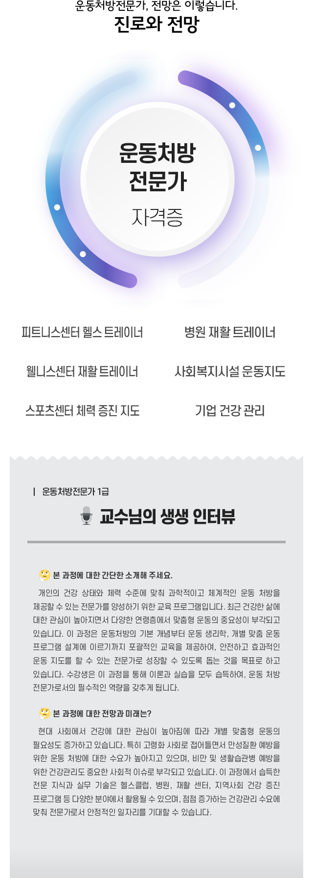 "¿îµ¿Ã³¹æÀü¹®°¡" °úÁ¤ÀÇ ¸ñÇ¥´Â ¿îµ¿ÀÌ ÇÊ¿äÇÑ »ç¶÷µé¿¡°Ô °úÇÐÀûÀ̰í ü°èÀûÀÎ ¿îµ¿ ó¹æÀ» Á¦°øÇÒ ¼ö ÀÖ´Â Àü¹®°¡¸¦ ¾ç¼ºÇÏ´Â °ÍÀÔ´Ï´Ù. ÀÌ °úÁ¤Àº °³ÀÎÀÇ °Ç° »óÅÂ¿Í Ã¼·Â ¼öÁØÀ» ¹ÙÅÁÀ¸·Î ¸ÂÃãÇü ¿îµ¿ ÇÁ·Î±×·¥À» ¼³°èÇϰí, ¿Ã¹Ù¸¥ ¿îµ¿ Áöµµ¸¦ ÅëÇØ ü·Â ÁõÁø°ú °Ç°À» µ½´Â °ÍÀ» ¸ñÇ¥·Î ÇÕ´Ï´Ù. ¿îµ¿ ó¹æÀÇ °³³äºÎÅÍ ¿îµ¿ »ý¸®Çаú °¢ ¿îµ¿ÀÇ È¿°ú¿¡ À̸£±â±îÁö À̷аú ½Ç½ÀÀ» ¸ðµÎ Æ÷ÇÔÇÏ¿©, ¼ö·áÀÚ´Â Àü¹® Áö½Ä°ú ½Ç¹« ´É·ÂÀ» °®Ãá ¿îµ¿ ó¹æ Àü¹®°¡·Î ¼ºÀåÇÒ ¼ö ÀÖ½À´Ï´Ù.