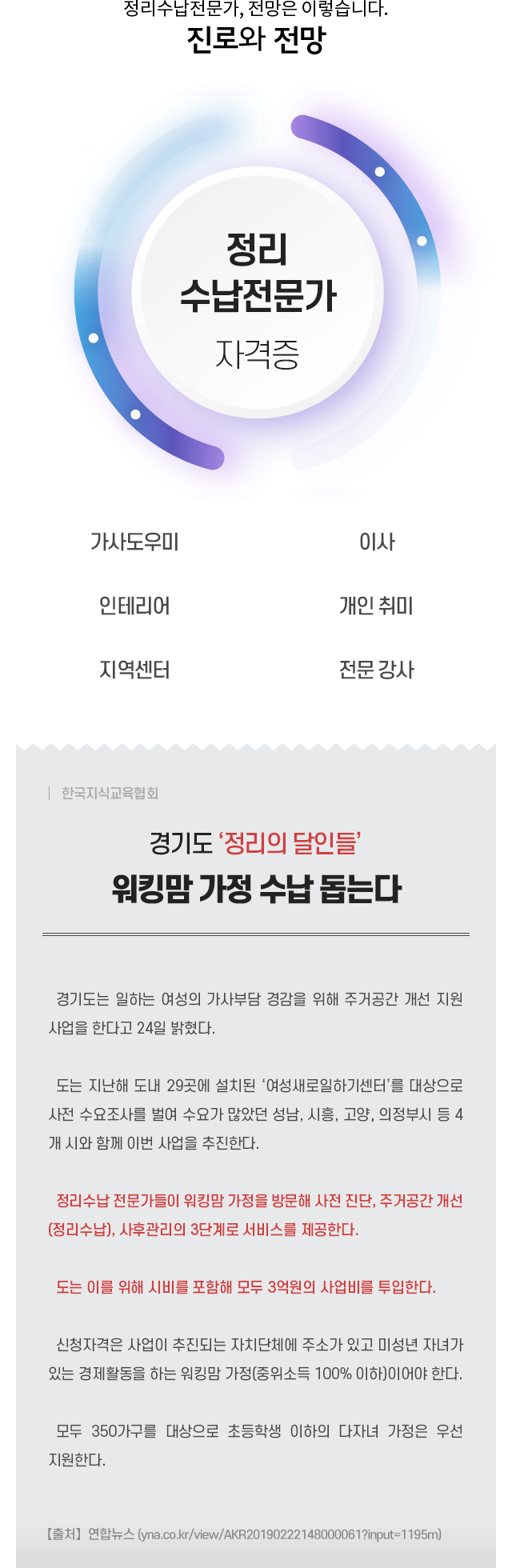 ÄèÀûÇϰí È¿À²ÀûÀÎ °ø°£ ±¸¼ºÀ» À§ÇØ ´Ù¾çÇÑ ¹°°Ç°ú °ø°£À» Á¤¸®Çϸç, ´Ü¼øÈ÷ Á¤¸®ÇÏ´Â °ÍÀ» µ½´Â °Í¿¡¼ ±×Ä¡Áö ¾Ê°í Á¤¸®¼ö³³ÀÇ ÀÇ¹Ì¿Í °úÁ¤, Á¤¸®ÀÇ ¿øÄ¢À» Àû¿ëÇÑ ÁÖ°Åȯ°æÀÇ Á¤¸®¼ö³³, °ø°£°ú ¹°Ç°ÀÇ Æ¯¼º¿¡ µû¶ó ÃÖÀûÀÇ ¼ö³³µµ±¸¸¦ ¼±º°ÇÏ¿© ½ÇÀü¿¡¼ Àû¿ëÇÒ ¼ö ÀÖ´Â °í°´ÀÀ´ë ȹý, °ßÀû »êÃâ µîÀ» ¼öÇàÇÏ´Â Á¤¸®¼ö³³Àü¹®°¡¸¦ ¾ç¼ºÇÏ´Â °ÍÀ» ¸ñÇ¥·Î ÇÕ´Ï´Ù.