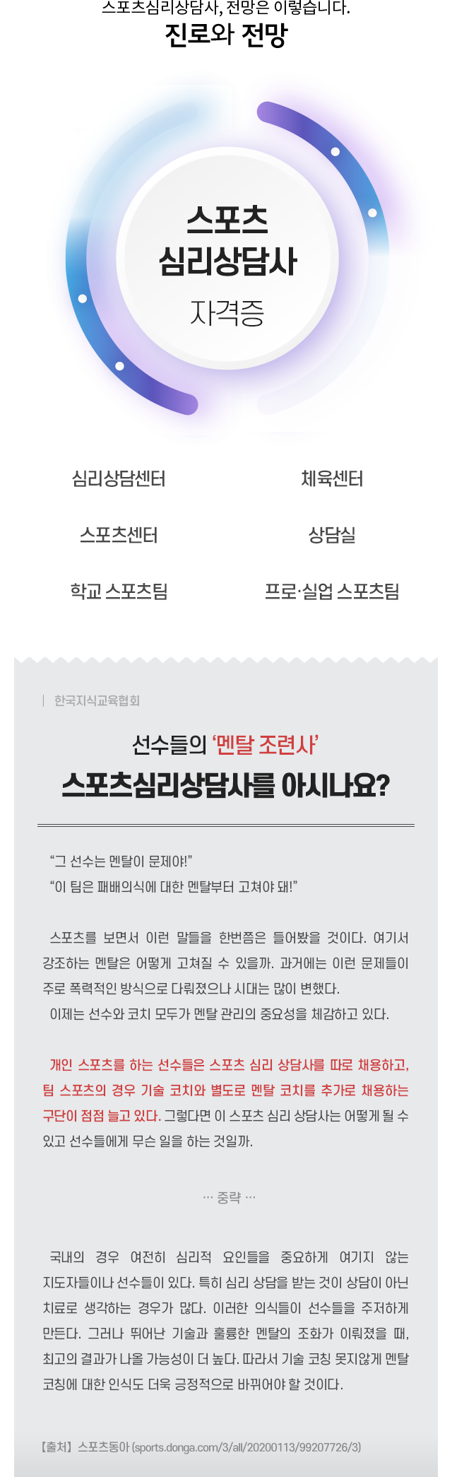 ½ºÆ÷Ã÷½É¸®»ó´ã»çÀÇ ÀÚ°ÝÃëµæÀ» À§ÇÑ °úÁ¤À¸·Î ½ºÆ÷Ã÷¿Í °ü·ÃµÈ ½É¸®Àû ¿äÀο¡ °üÇÑ Á¤º¸ Á¦°ø ¹× ¿îµ¿À̳ª ½ºÆ÷Ã÷¿¡ Àû¿ëÇÒ ¼ö ÀÖ´Â ÀÎÁö, Çൿ, »çȸ½É¸® ¹× Á¤¼Àû ±â¼úÀ» ÁöµµÇÒ ¼ö ÀÖ´Â ½ºÆ÷Ã÷½É¸® »ó´ã Àü¹®°¡°¡ Áö³à¾ß ÇÒ ÀÚÁúÀ» ÇÔ¾çÇÑ´Ù.