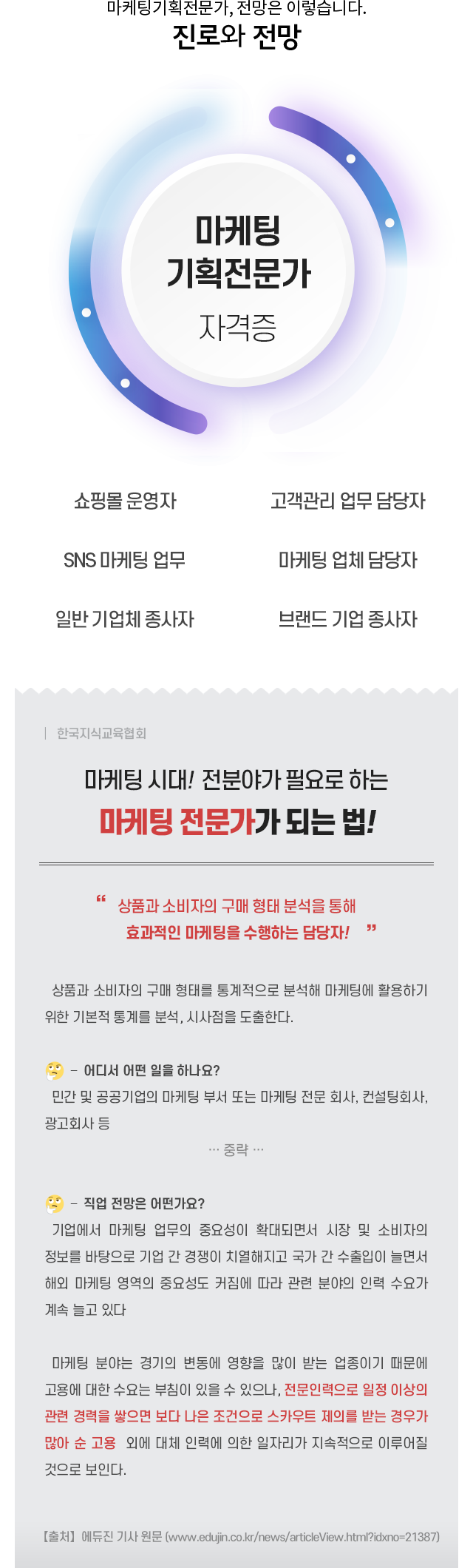 ¸¶ÄÉÆÃ ±âȹ¿¡ °üÇÑ Àü¹®ÀûÀÎ Áö½Ä°ú ÀÌÇØ¸¦ ¹ÙÅÁÀ¸·Î ¸¶ÄÉÆÃ È°µ¿À» À§ÇÑ ¿î¿µÀ» °èȹ, Á¤È®ÇÑ ¸¶ÄÉÆÃ ¼±Á¤°ú ¸ñÇ¥ ¹× Àü·«À» ¼ö¸³ÇÏ´Â Àü¹®Àû ¿ªÇÒ ¼öÇà