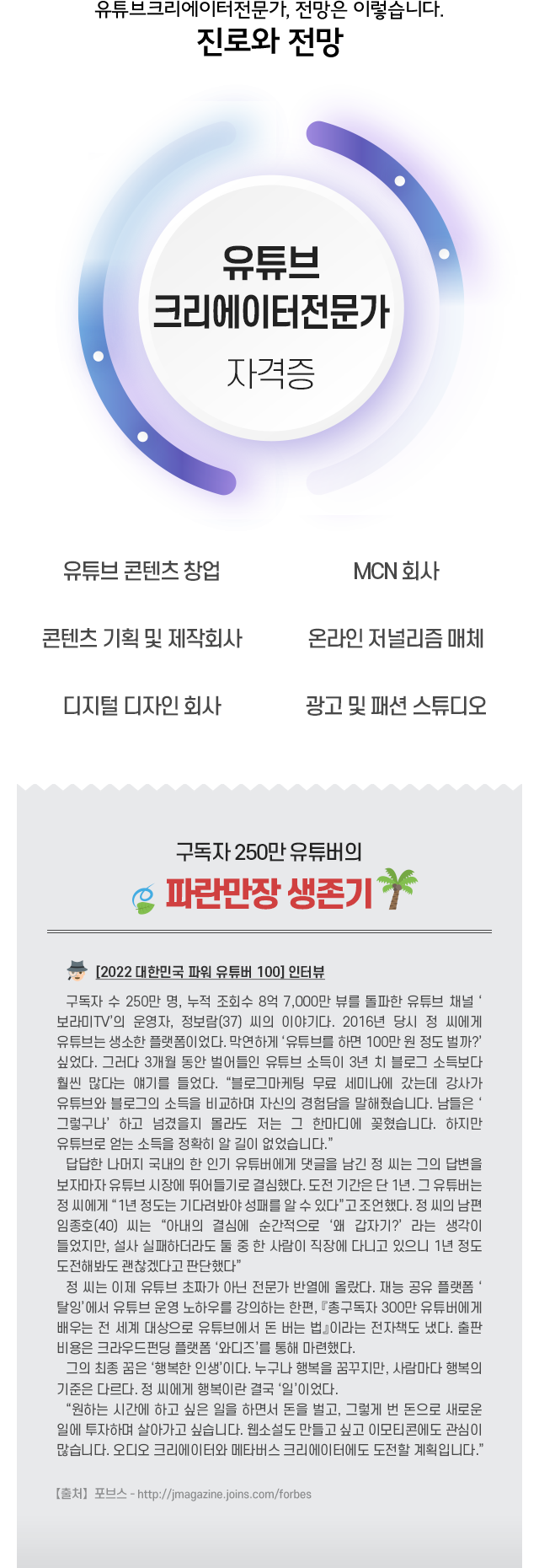 À¯Æ©ºêÅ©¸®¿¡ÀÌÅÍÀü¹®°¡´Â ÀÎÅͳݿ¡¼ Á¦°øµÇ´Â À¯Æ©ºê »çÀÌÆ®¸¦ ÅëÇØ µ¿¿µ»óÀ» ±âȹ, ÃÔ¿µ, ÆíÁýÇØ¼ ¿Ã¸®´Â ¾÷¹«¸¦ ´ã´çÇÑ´Ù. º»ÀÎÀÇ ÄÜÅÙÃ÷¸¦ Á÷Á¢ ¾ÆÀ̵ð¾î ±âȹºÎÅÍ, ÈÄ¹Ý ÀÛ¾÷±îÁö Àü °úÁ¤ÀÇ ÇÁ·Î¼¼½º¸¦ ½ÀµæÇϰí, ÄÜÅÙÃ÷ Á¦ÀÛ Àü¹®°¡¸¦ ¾ç¼ºÇÏ´Â ¸ñÀûÀ» µÎ°í ÀÖ´Ù.