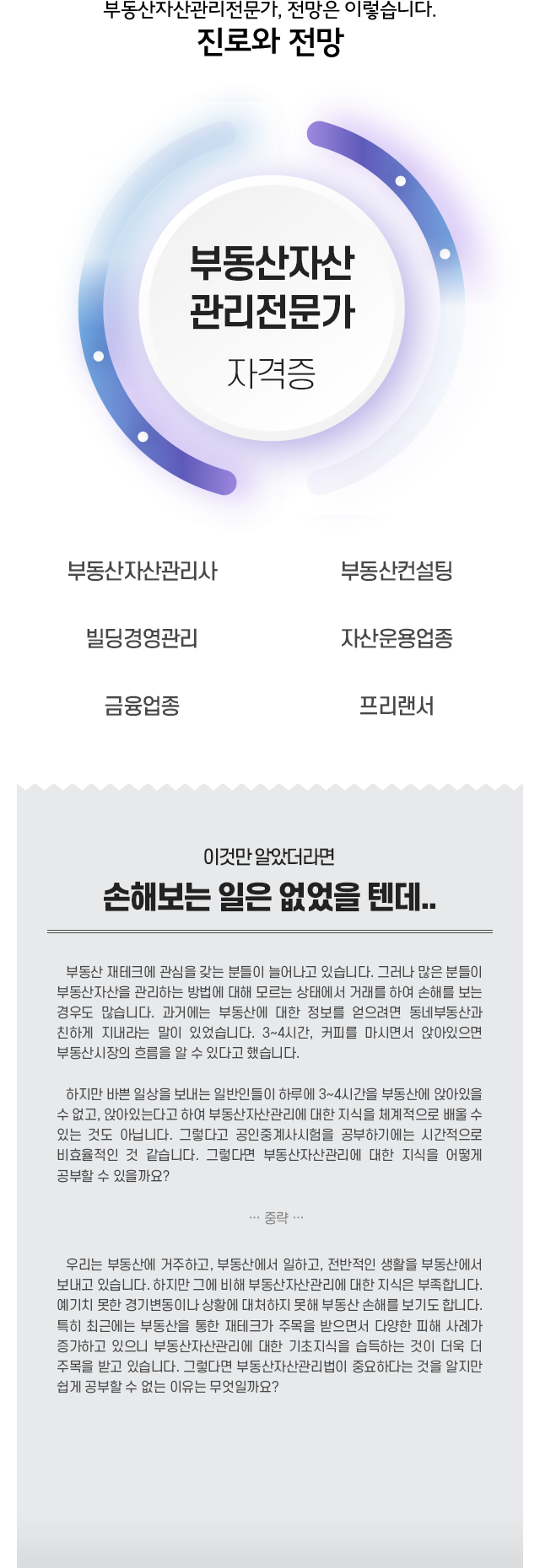 ºÎµ¿»êÀÚ»ê°ü¸®Àü¹®°¡´Â ¼Ò±ØÀû Àǹ̿¡¼ ºÎµ¿»êÀÇ ¿î¿µÀ̳ª À¯Áö¿¡ ¼Ò¿äµÇ´Â ºñ¿ëÀ» ÃÖ¼ÒÈÇÏ´Â È¿À²ÀûÀÎ °ü¸®¸¦ ÀǹÌÇϰí, Àû±ØÀûÀ¸·Î´Â ºÎµ¿»êÀÇ Ãëµæ, º¸À¯, ¸Å°¢ µî ºÎµ¿»ê Ȱµ¿ÀÇ ´Ü°è¿¡¼ À§ÇèºÐ»ê, Æ÷Æ®Æú¸®¿À ±¸¼º µîÀ» ÅëÇØ ºÎµ¿»ê ¼ÒÀ¯ÀÚÀÇ Àç»êÀû °¡Ä¡¿Í ¼öÀͼºÀ» ±Ø´ëÈÇϱâ À§ÇÑ Àü¹®ÀûÀ̰í Á¾ÇÕÀûÀÎ °ü¸®¸¦ ÀǹÌÇÑ´Ù.