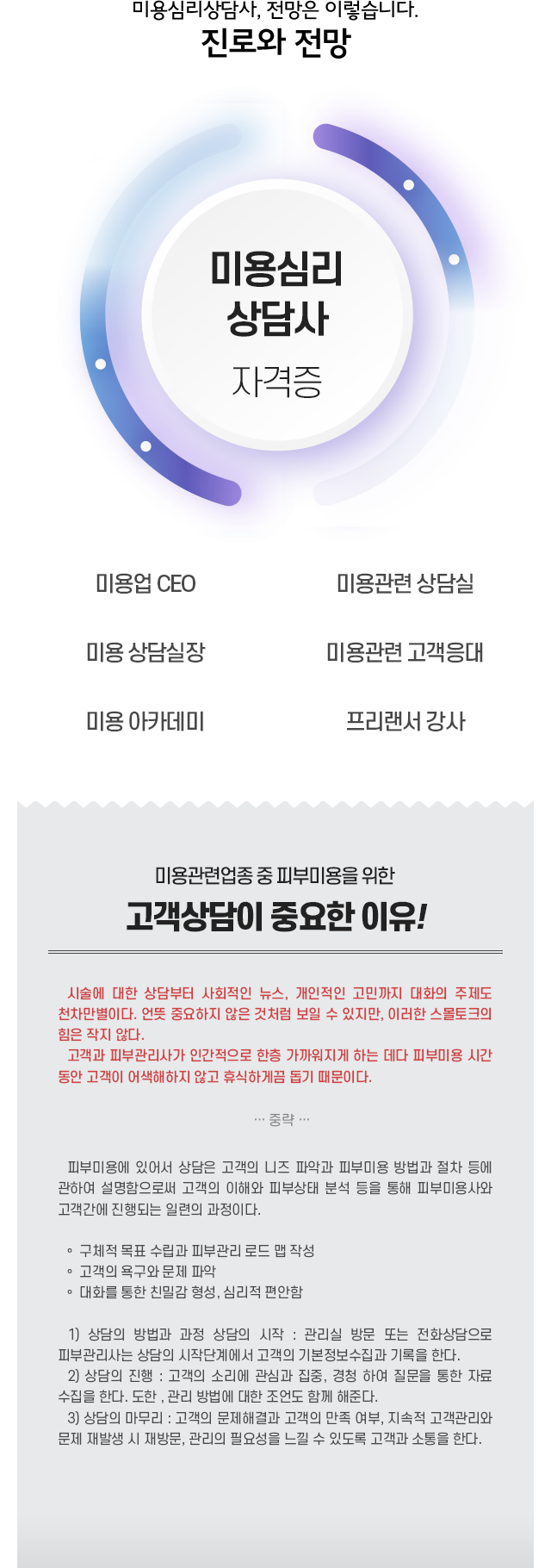 º» °úÁ¤ÀÇ ÇнÀÀ» ÅëÇØ ¹Ì¿ë ¹× »çȸ½É¸®ÇÐÀÇ °³³ä¿¡ ´ëÇÑ ÀÌÇØ¸¦ ¹ÙÅÁÀ¸·Î ¹Ì¿ë ÇöÀå¿¡¼ ÇÊ¿äÇÑ ½É¸® »ó´ã ¼ºñ½º¸¦ ÅëÇØ °í°´À» Á» ´õ ÀÚ¼¼È÷ ÀÌÇØÇÏ°í °í°´ÀÇ ´ÏÁî¿¡ ¸ÂÃç È¿°úÀûÀÎ »ó´ã ¼ºñ½º¸¦ Á¦°øÇÒ ¼ö ÀÖµµ·Ï ÇÑ´Ù.